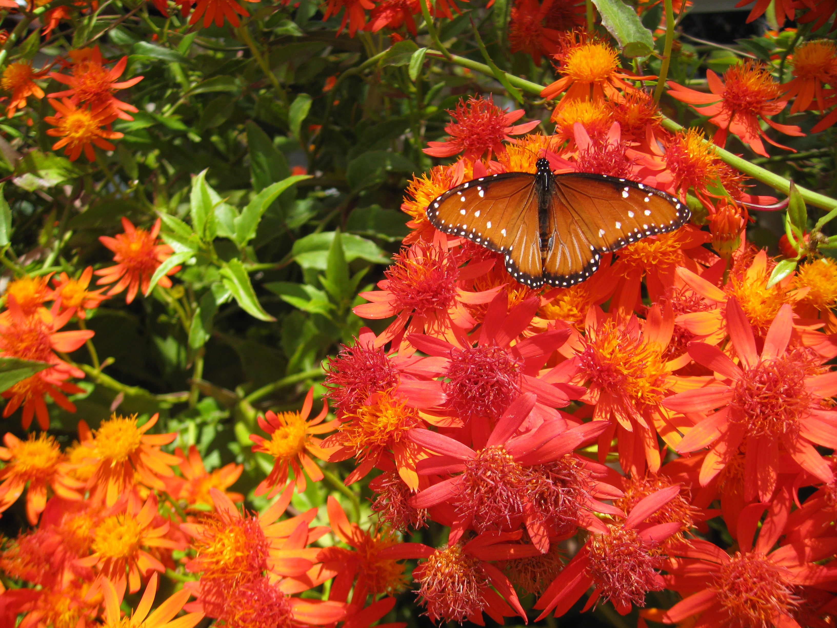 As I approached, I noticed some Queen butterflies nectaring on the blooms and loved the brilliant tone on tone effect: