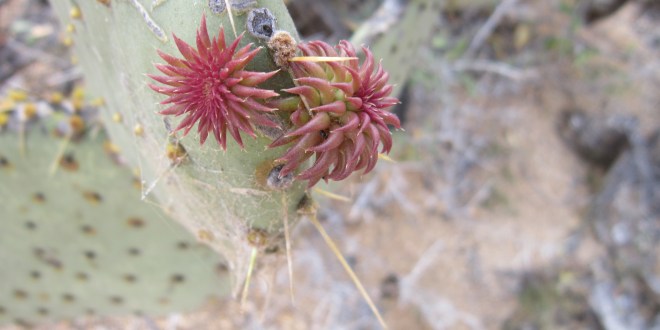 The nopal (prickly pear cactus) pictured above appears to be blooming at first glance.  But it’s actually putting out a new penca, a fleshy new leaf pad like the one in the photo below: