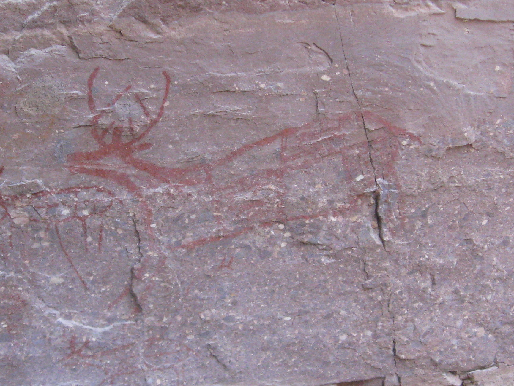 According to knowledgeable and friendly guide Salvador Castro Drew, a native of the nearby town of Mulege, the earlier paintings, part of the Great Mural tradition of central Baja California, were created  3000 to 7000 years ago.  La Trinidad’s most well-known and most elegantly formed painting is its large (perhaps ten by twelve feet) checkerboard-bodied deer: