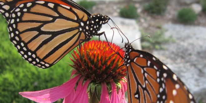 Something unexpected happens when these two seemingly very similar butterflies, shown above sharing a coneflower in my Texas hill country garden, open their wings.